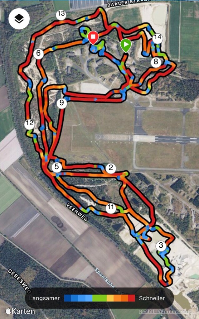 Vom Untergrund her waren schätzungsweise 10% Asphalt und 90% unbefestigter Untergrund (Sand und Kies (gut laufbar) sowie Matsch und Erde).